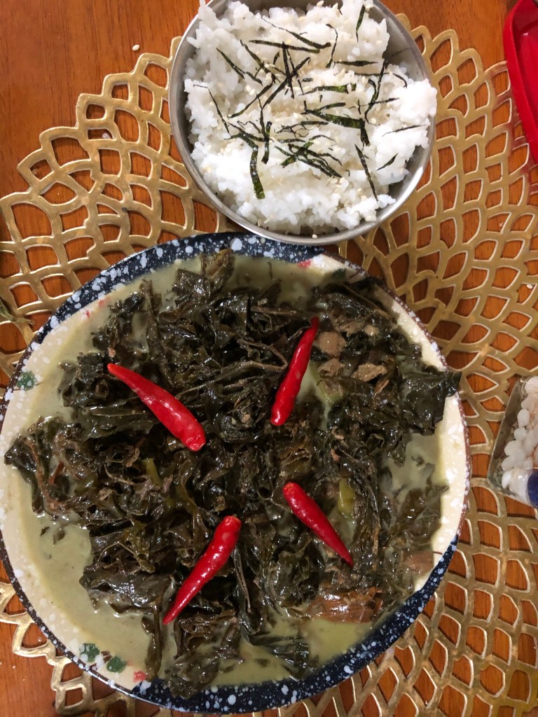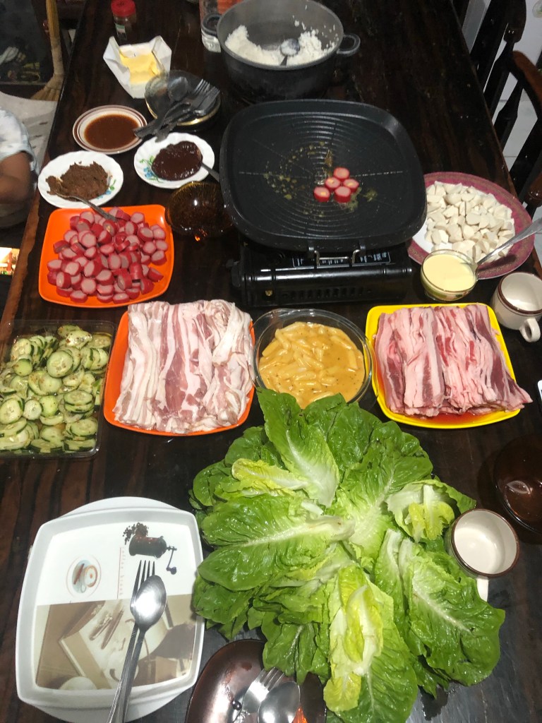 TOSILOG I woke up early in the morning to start my day because I am a morning person, I made this Tosilog for my breakfast, I made a sinangag na kanin out of my rice from yesterday and this is a way for us not to waste food. I added slices of tomatoes because it’s always been my favorite side dish and it balanced the sweetness of the meat This chicken tosino is from our province made by my father, He marinated it using sugar, soy sauce, Garclic, ginger and pepper, He didn’t add preservatives that’s why it’s still healthy.LAING For lunch I decided to have a healthy meal, I bought Laing from the food store or what we call “karinderya” , This is a Healthy creamy Taro leaf and a cup of rice. Laing is made with dried taro Leaf, Coconut milk, Garlic, Ginger, and pepper. Samgyupsal for Early dinner We prepared our table for korean bbq night, A lettuce, pork, hotdog, Korean carbonara rice cake, and pickled cucumber. We made a pickled cucumber the day before using vinegar, chili powde and salt. This is my favorite meal of the day because my friend and mg sister is with me and it’s just my favorite food.